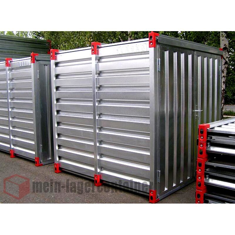 Die Lagercontainer sind aus 0,75 mm verzinktem Trapezblech gefertigt. Die Tragprofile sind aus 2 mm verzinktem Blech gefertigt. Der Container-Boden ist aus 35 mm gehobelten Nut- und Federholzbrettern gefertigt. Die Container sind mit Einzeltür und Doppeltür mit Klinke und Zylinder-Schloss in Stirn- oder Längsseite erhältlich. Das lichte Maß der Doppeltüre ist 1930x1930 mm.